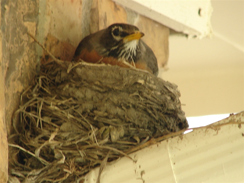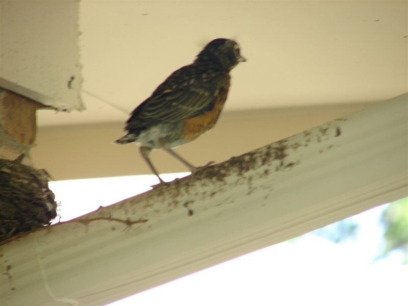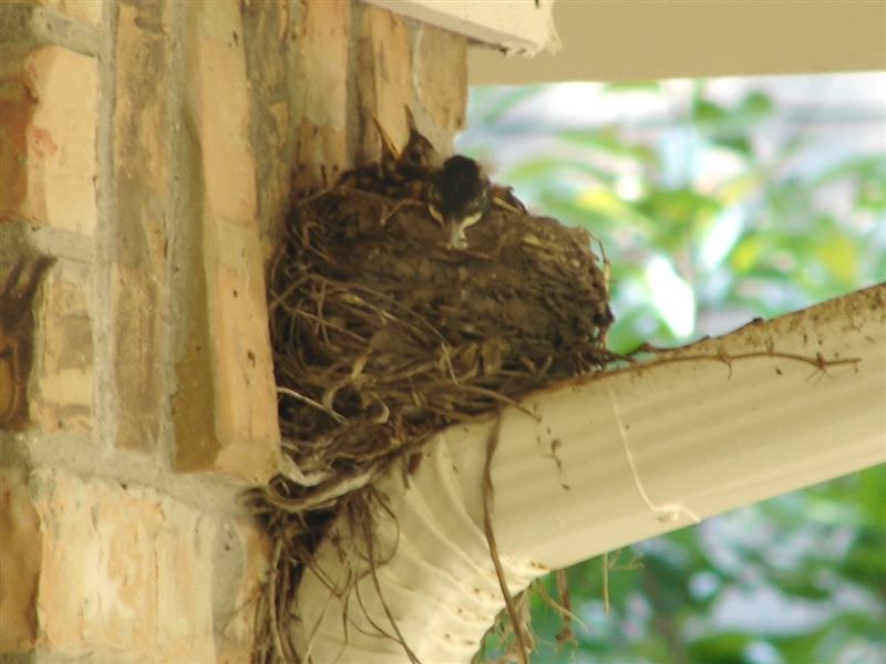 Every year a robin, cardinal, or blue-jay builds its nest somewhere in our back yard. But this is the first time I’ve ever watched its “family” grow. This is the first time a bird has ever nested on top of one of our gutters, protected under the eaves of the house. And this is the first time I ever witnessed a baby robin–or any “baby” bird take its first flight, and see the nest empty before my eyes.
